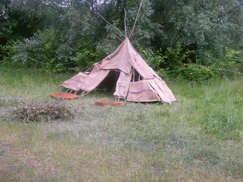 Wij geven ook ¨WORK SHOP’s¨ , zie hier b.v. de z.g. “ Sound- ,of Swamp-Tipi’s ” bouwen.